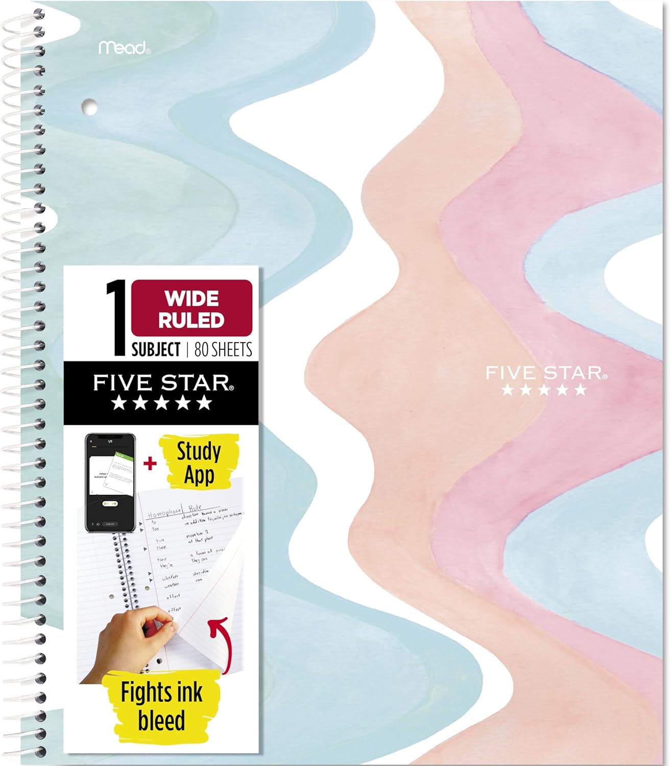 LASTS ALL YEAR. GUARANTEED The Five Star Spiral Notebook is a great choice for classroom notes. The colorful Pastel Waves design features artistic watercolor brush strokes for a sense of serenity. Compatible with the Five Star Study App, you can..